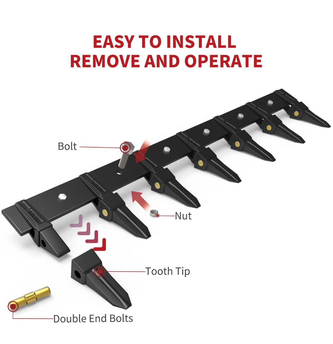 The bolt-on design guarantees stability and safety while working, and we have included mounting screws in the package for easy installation. he Bucket Tooth Bar features 6 teeth that can be conveniently removed and replaced, and are secured with double-end bolts; No need for an extra bucket, enabling you to use it for an extended period without needing an extra bucket.