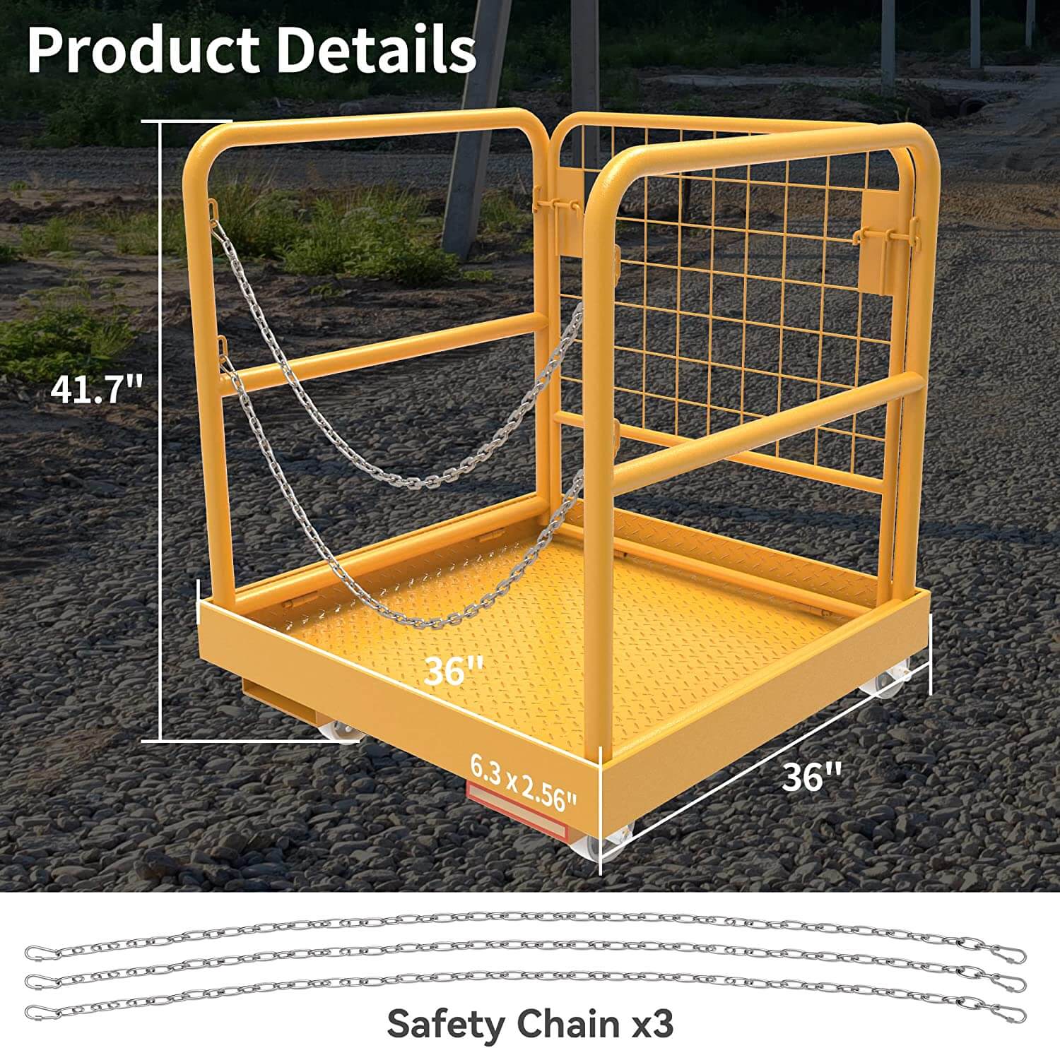 This forklift cage can be used with all standard forklifts; It is convenient for most aerial operations such as changing lights, painting, roof repair, and tree services; Can be used in multiple places including warehouses, construction sites, farms, etc.