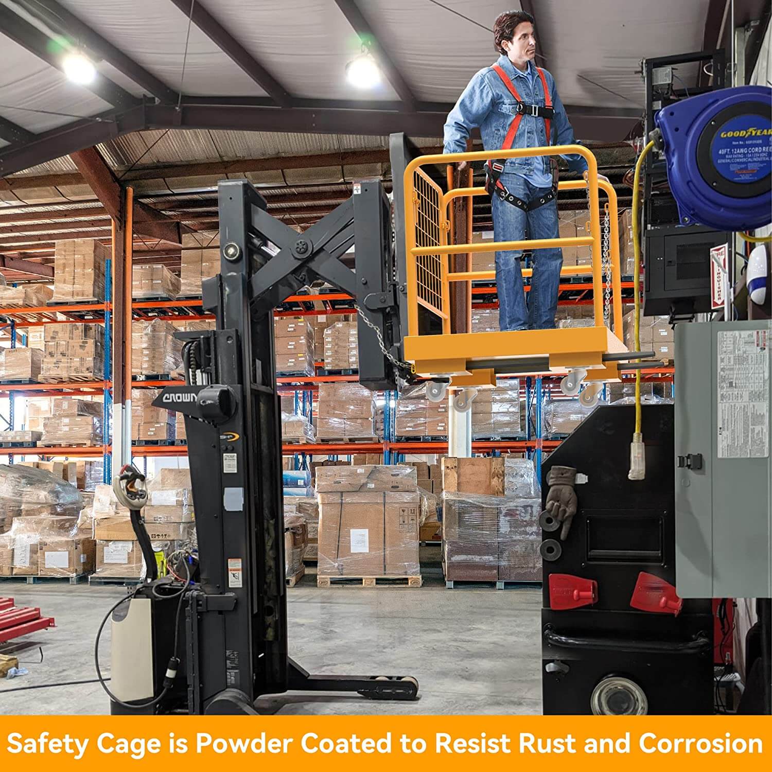 This forklift safety cage can be used with any standard forklift, and with a capacity of up to 1150 lbs, you'll be able to handle aerial tasks with ease. There are 4 universal wheels for easy mobility